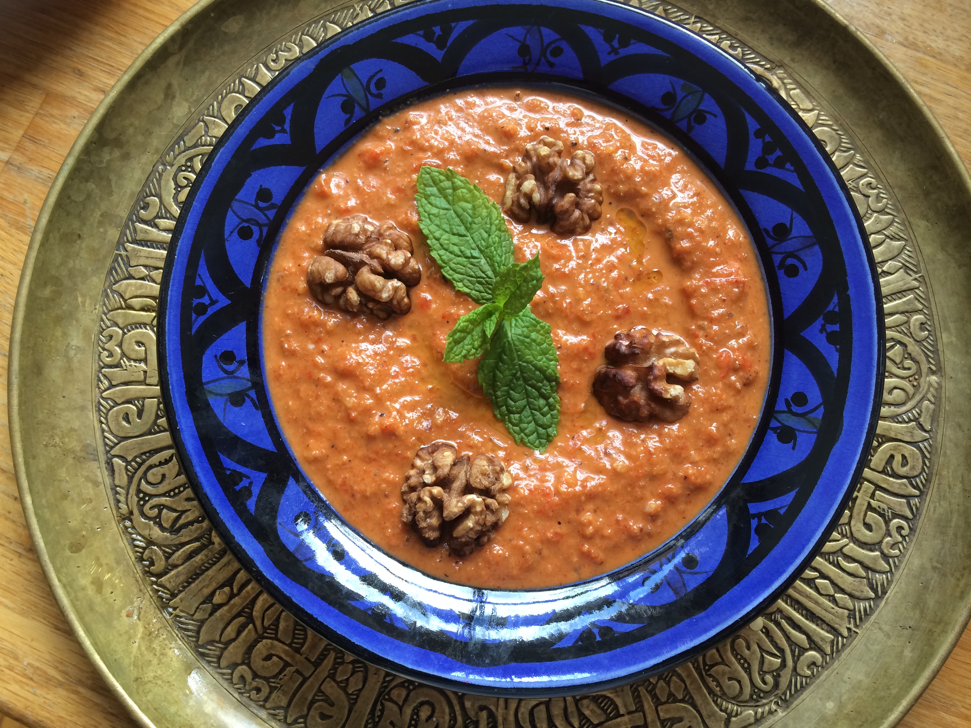 DSC_0937I have been making this slightly spicy dip for years.  My friends have always told me that I have got the recipe wrong.  But they still love it so I have never changed it very much.  The mouhamara you get in a restaurant is very heavy on the walnuts and to my taste a little dry — more like a paste than a dip.  I think I may have got the ingredients mixed up when I first made the dish, as I reverse the main taste from walnuts to peppers.  This makes it much juicier.  As with so many Arab dishes, there are many regional variations — not just from country to country but from one village to another.  One of the most common versions of the dish is Halabi — meaning it’s from Aleppo in Syria.  When I first made this many years ago, I would never have thought that that name — once so pregnant with all that is most precious in Arab history and culture — would become as scarred as my own home city, Beirut.