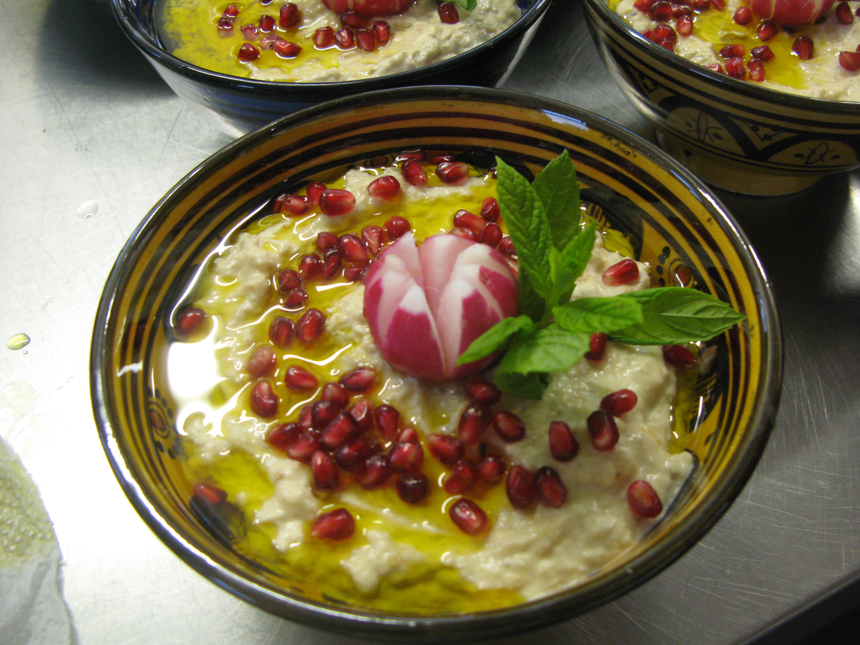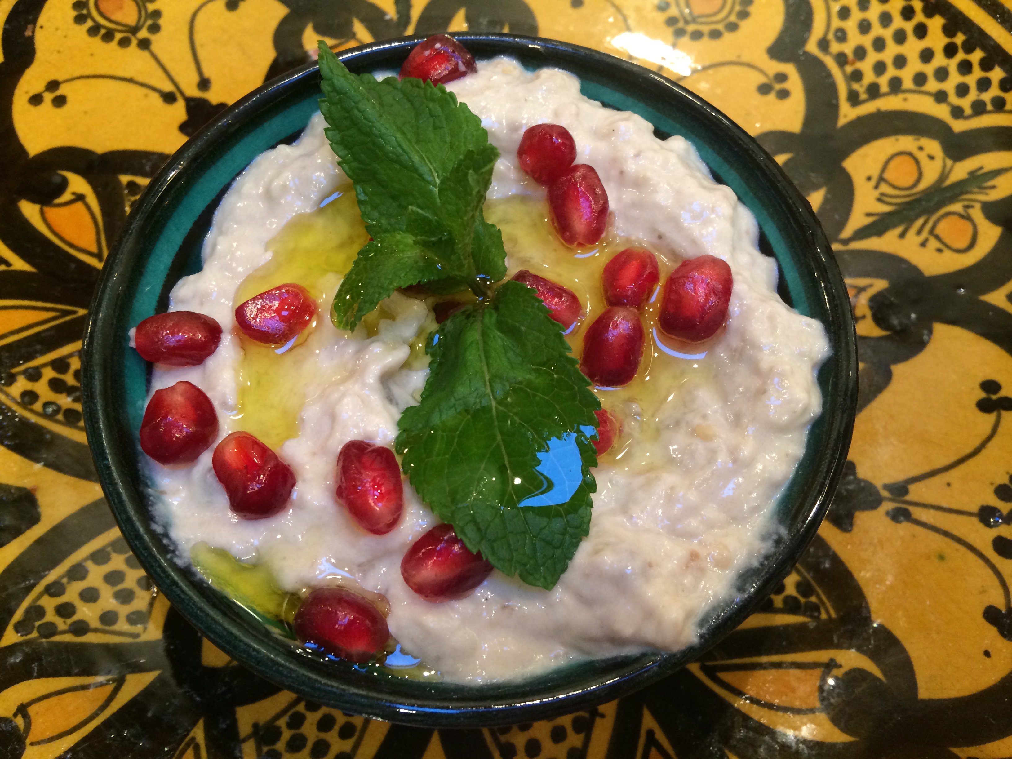 Anyway, the thing I love about Moutabal isn’t the aubergine but the pomegranate seeds I add as a garnish on top.  Any excuse to have them — one of the great delights of Lebanese food.  I even tried to grow a pomegranate bush in London.  It didn’t quite work — at least not yet — but I haven’t given up.