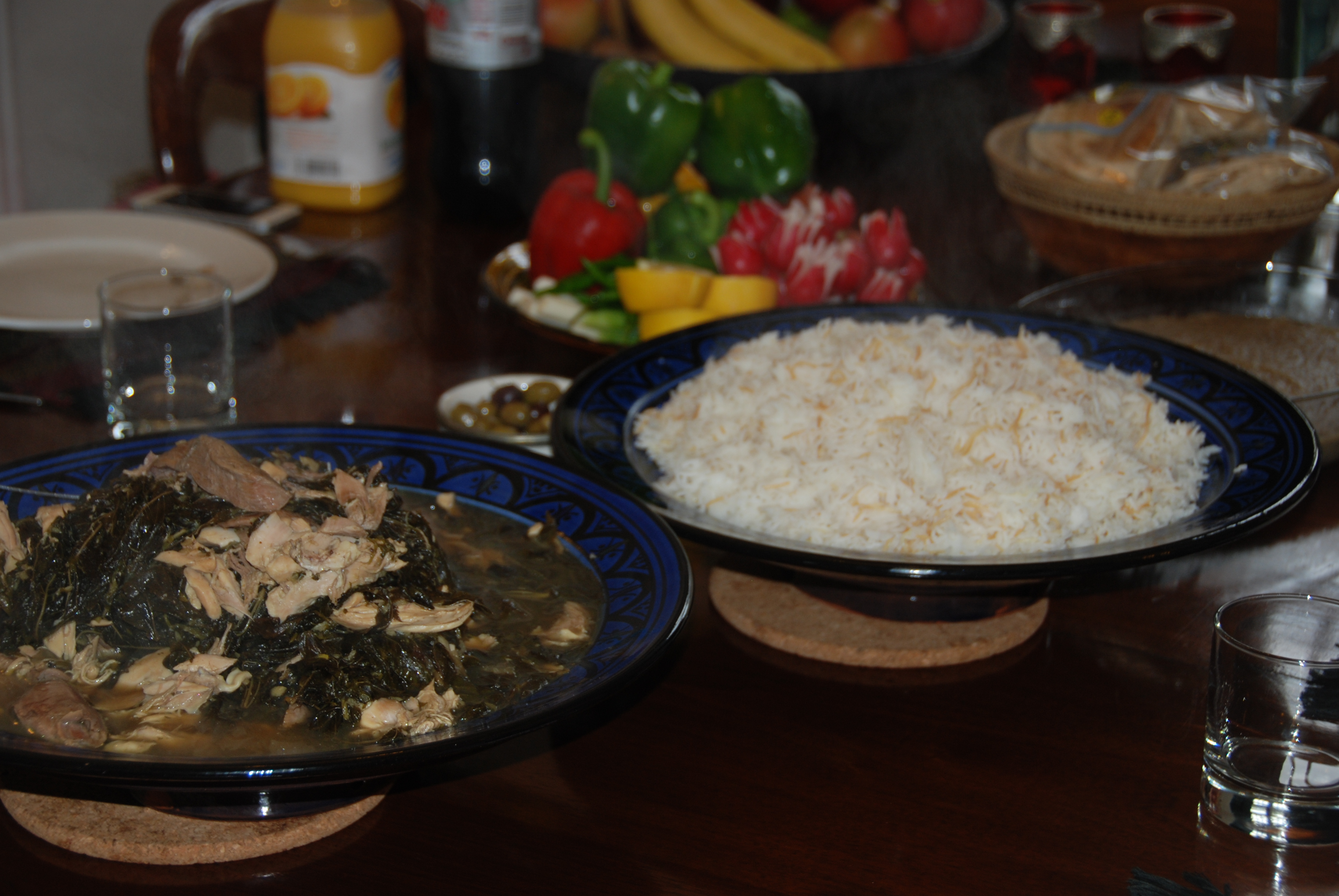 Now we are moving away from poor man’s dishes. For me and my friends in Beirut, the idea of mulukhia is a party in itself. I am not quite sure why, but it always seems like a big social event when we make the dish. Perhaps it’s because of the whole rigmarole over sourcing the mulukhia leaves– which are also known as jew’s mallow — and then preparing them. My father gets the spinach-like leaves from a farm in southern Lebanon these days. They’re brought up fresh to Beirut where they are washed and dried and prepared for eating with the best cuts of meat. My twist is to serve the mulukhia with both chicken and lamb. My sourcing is even more elaborate. Any Lebanese expatriate who goes home knows that they will be hauling presents and various other supplies both on the way out and the way back. I get my family members to act as mulukhia mules, bringing me a bag of leaves from my father’s supply. At least it’s probably the lightest thing they’ll be carrying. I actually made mulukhia for a group of Lebanese friends today — and served it with mujadara on the side, combining two Lebanese staples, the most basic and one for special occasions. As ever, it went down very well and made the occasion seem that little bit more special.