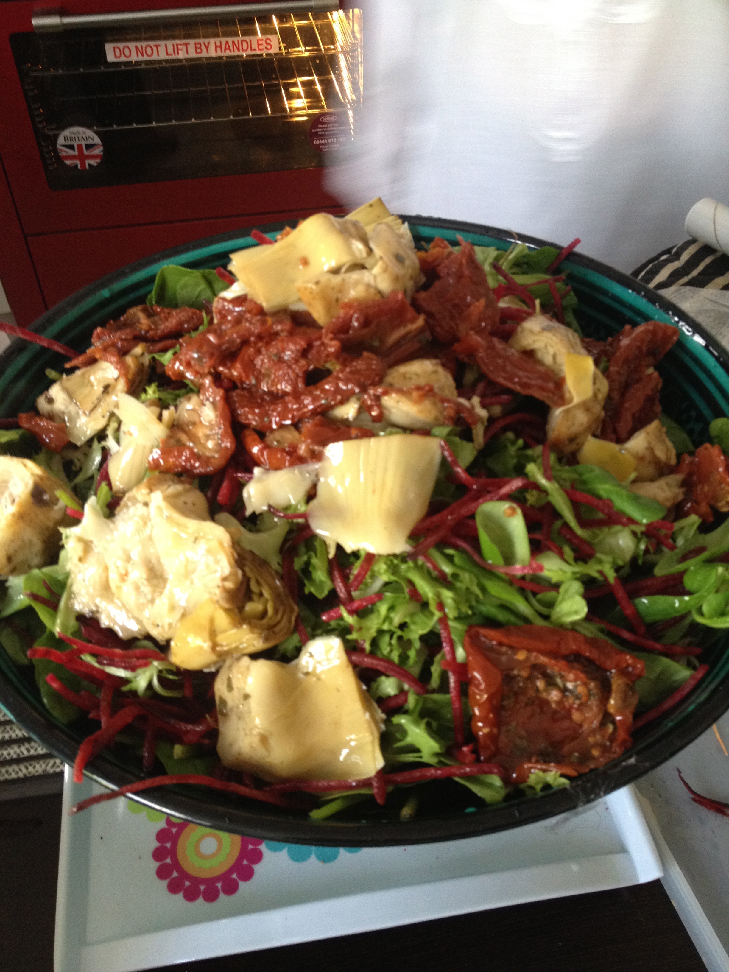 But the little recipe I am giving here is my own invention, which I came up with after discovering and falling in love with sun-dried tomatoes — again here in England rather than back home in Lebanon. With two lovely spring days just past, it seems an appropriate time for this delicious, healthy and refreshing salad.
