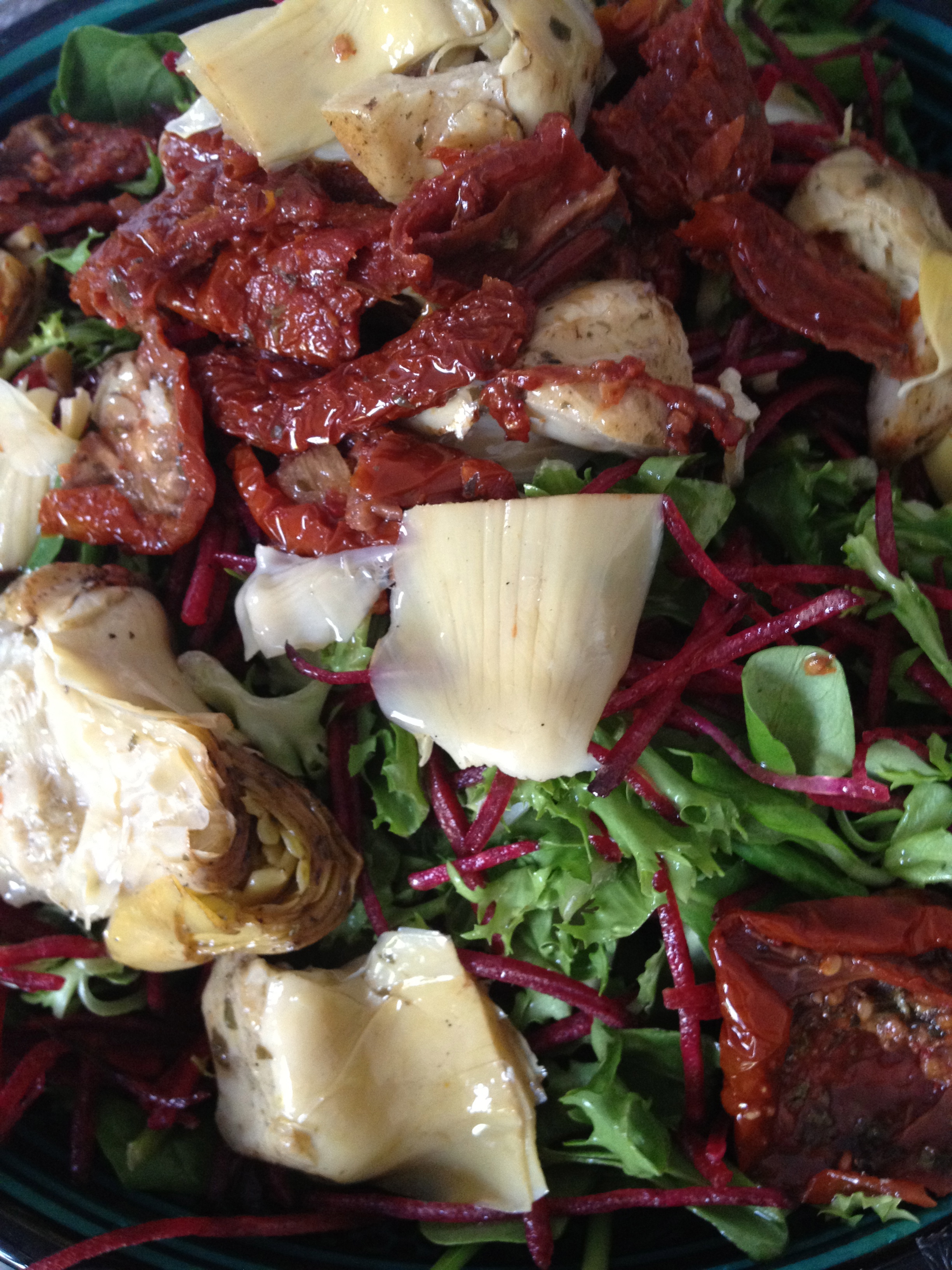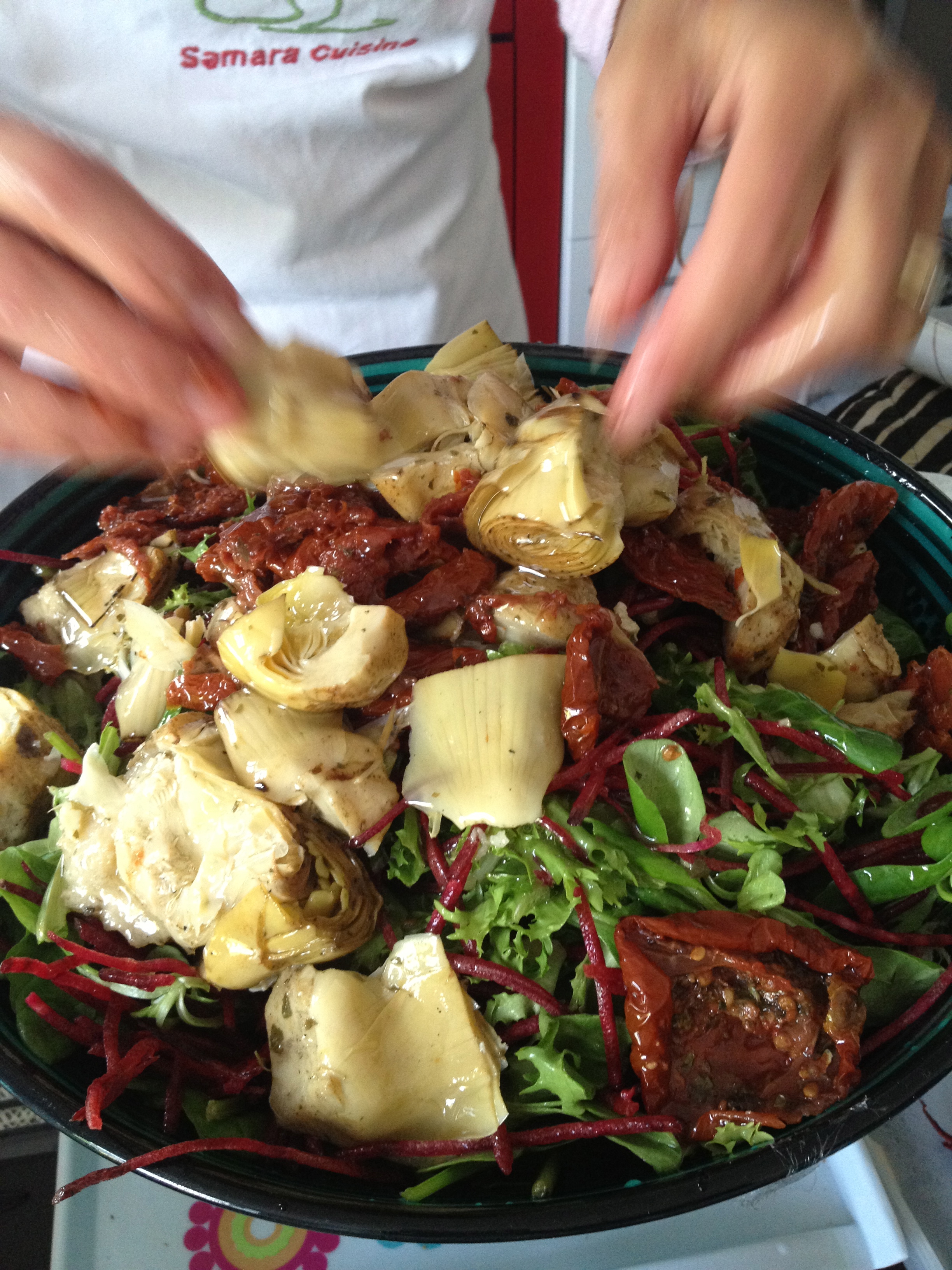 - In a large salad bowl put the artichoke and sun dried tomatoes
