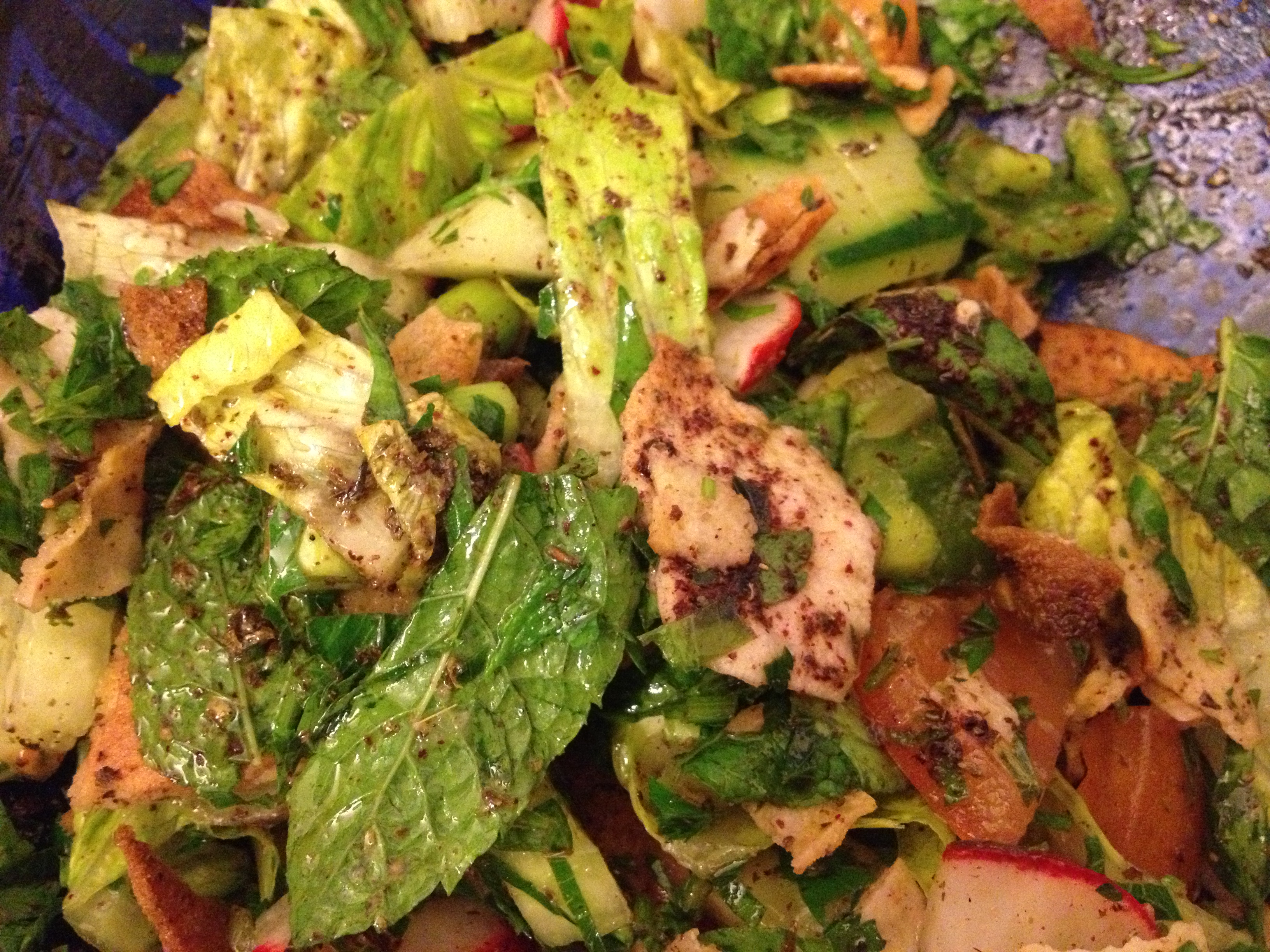 summer. Back when I was growing up in Lebanon, my grandparents were able to gather the ingredients from the orchard behind their house. As long as the chickens didn’t break in, their summer vegetable garden provided us with delicious salads every day. Of course, the extra element that makes fattoush special beyond the freshness of the herbs and vegetables is the toasted pitta bread that you need to break up and scatter through the salad.