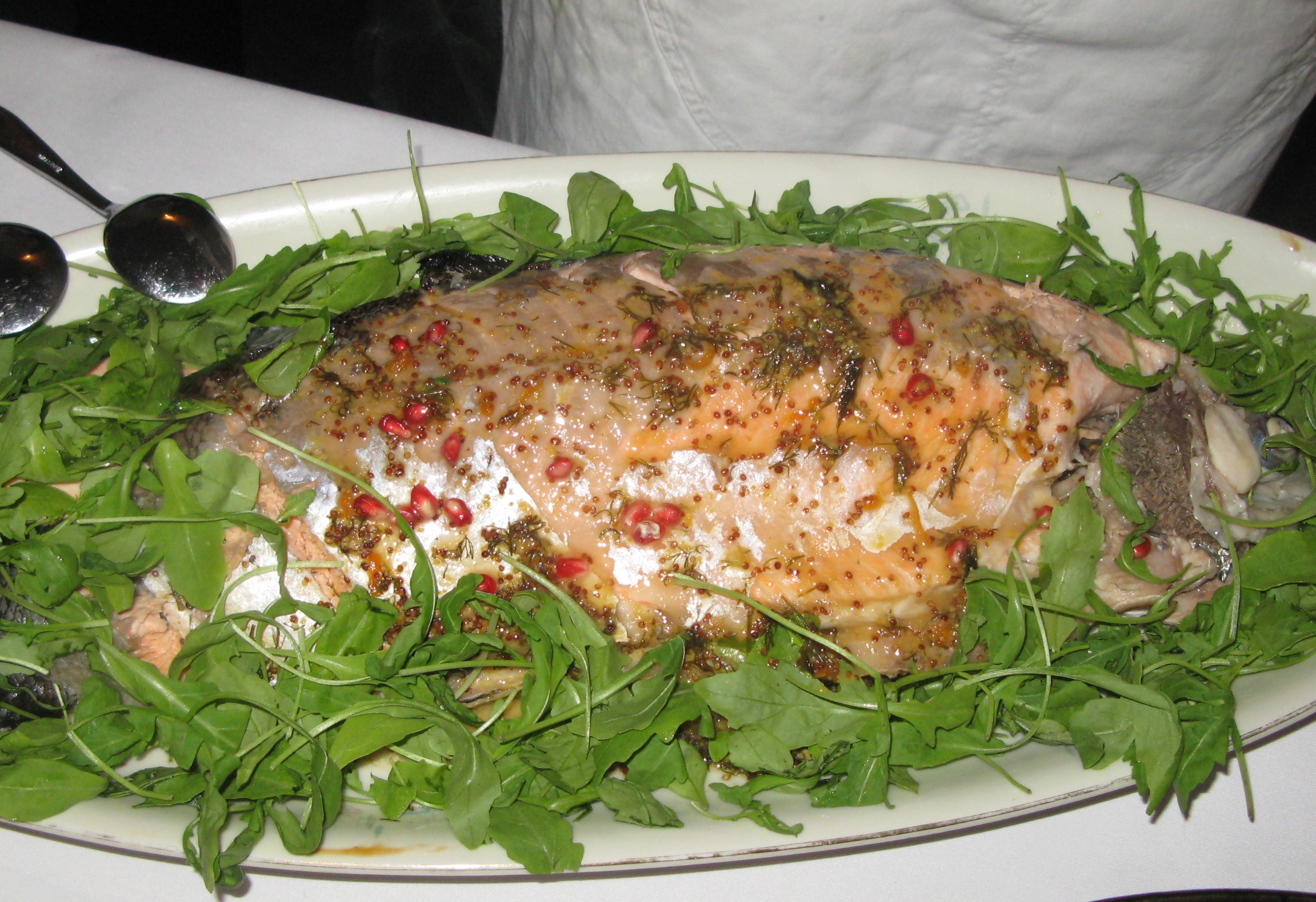 - 40 minutes before serving the fish, put it in a large baking tray and cover tightly with foil, and bake in a hot oven, 200 degrees, on the middle shelf for 15 minutes