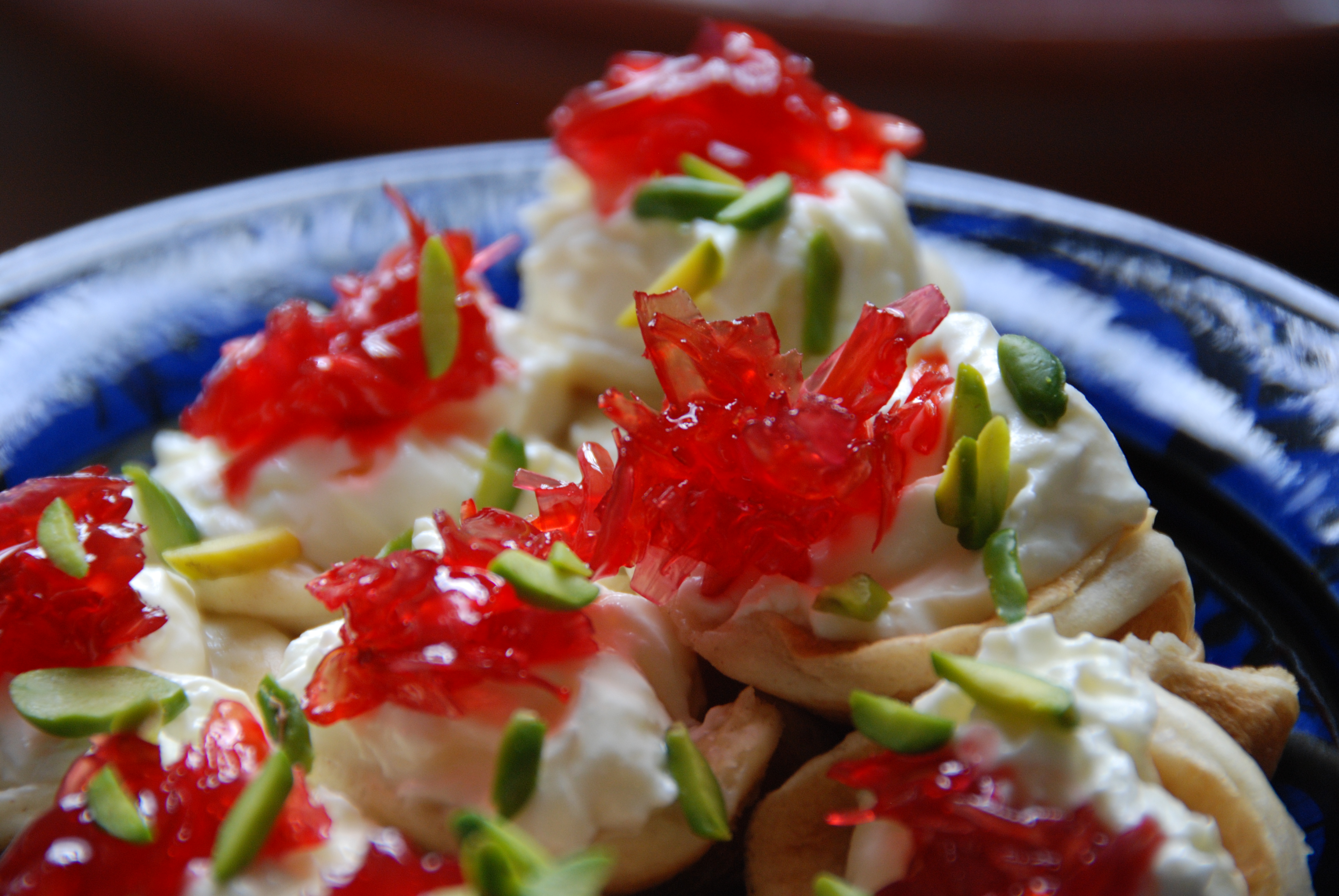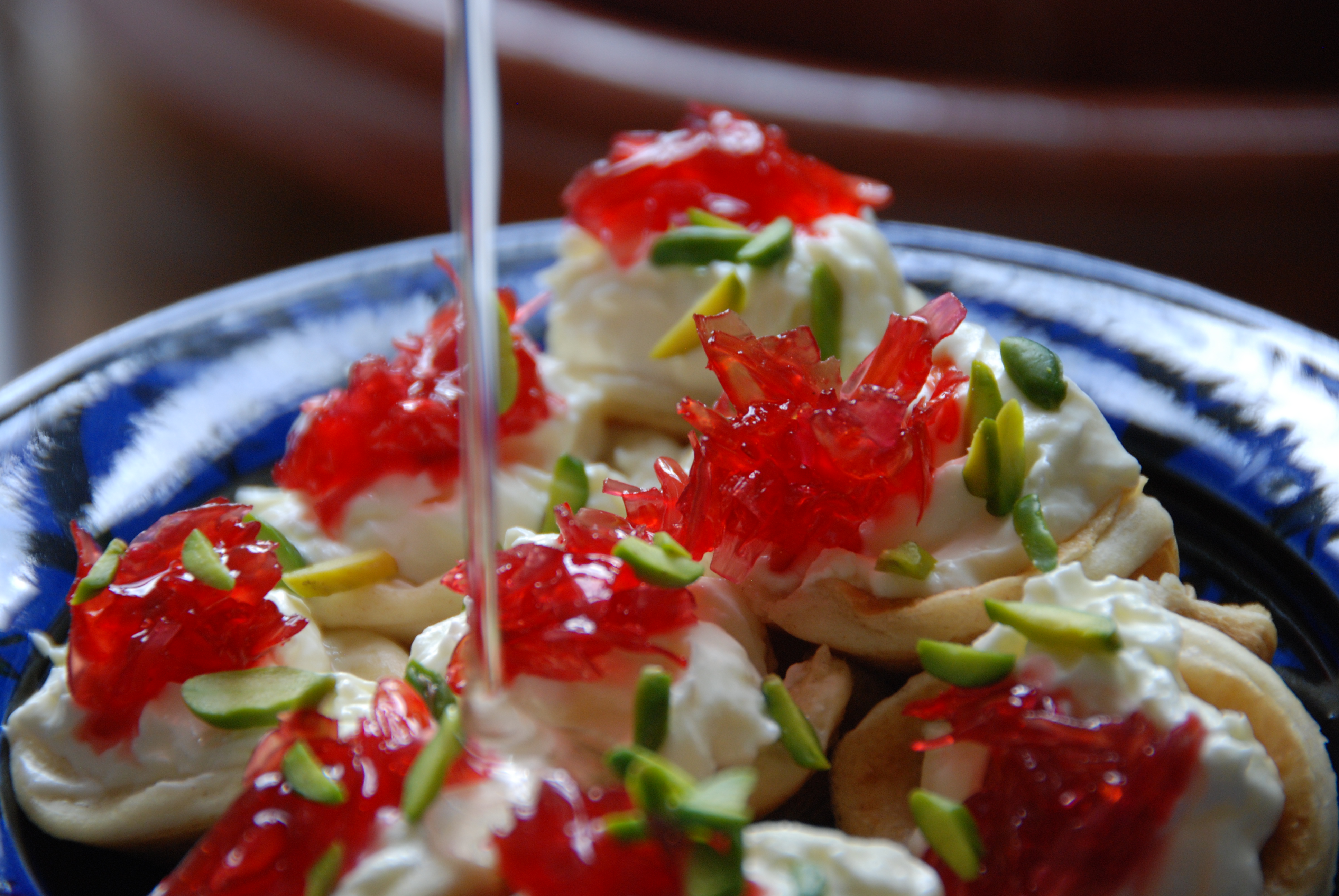 In Beirut — in downtown — kids come to play with the pigeons that cluster there as they do in most big cities, under the watchful eyes of the soldiers guarding the not exactly overworked parliament building on the other side of the square. But the birds I am thinking about right now don’t fly, although they are equally if not more delicious. Another Ramadan treat, Assafiri ( or little birds) is a small soft pancake brimming with syrup and stuffed with cheese. My little twist on it is to use mascarpone. It’s clearly on the non-austere side of Ramadan rituals. Again, I used to make these little cakes for my friends at university, who came to visit me in the dying days of the civil war, as my mind was moving secretly more and more towards new adventures — which ended up involving elopement and a kind of exile. Tasting the Assafiri now, I am reminded of those strange days when I was privately contemplating the possibility of a future that had nothing to do with my past. I didn’t know at the time that I would take more with me than a few dated dresses and an eighties bouffant from one of the surviving hairdressers around Hamra. The little birds I am serving my friends this Ramadan at iftar are part of the Beirut I brought with me.