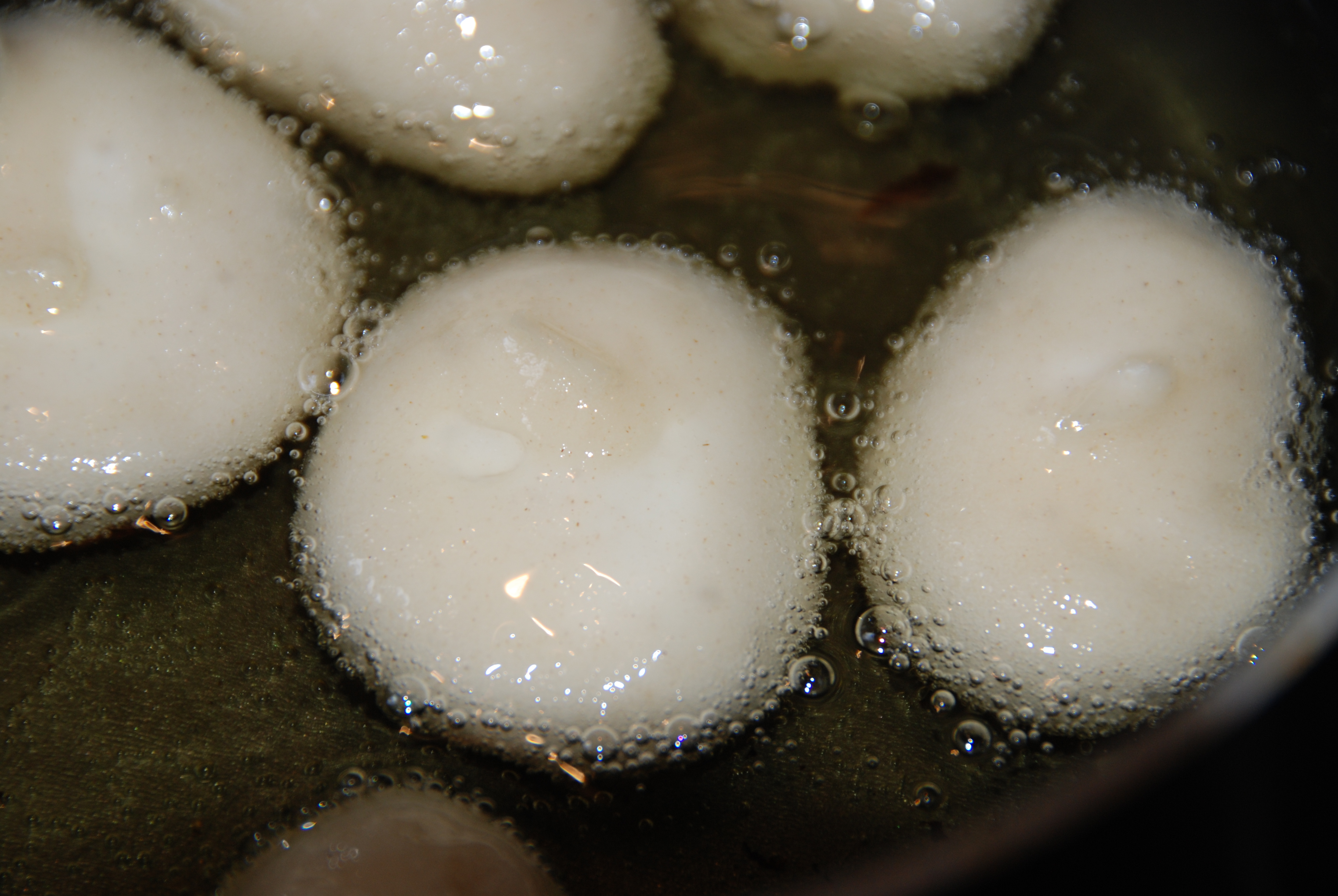 Once the little balls start to pop to the surface, put the pan back on the flame