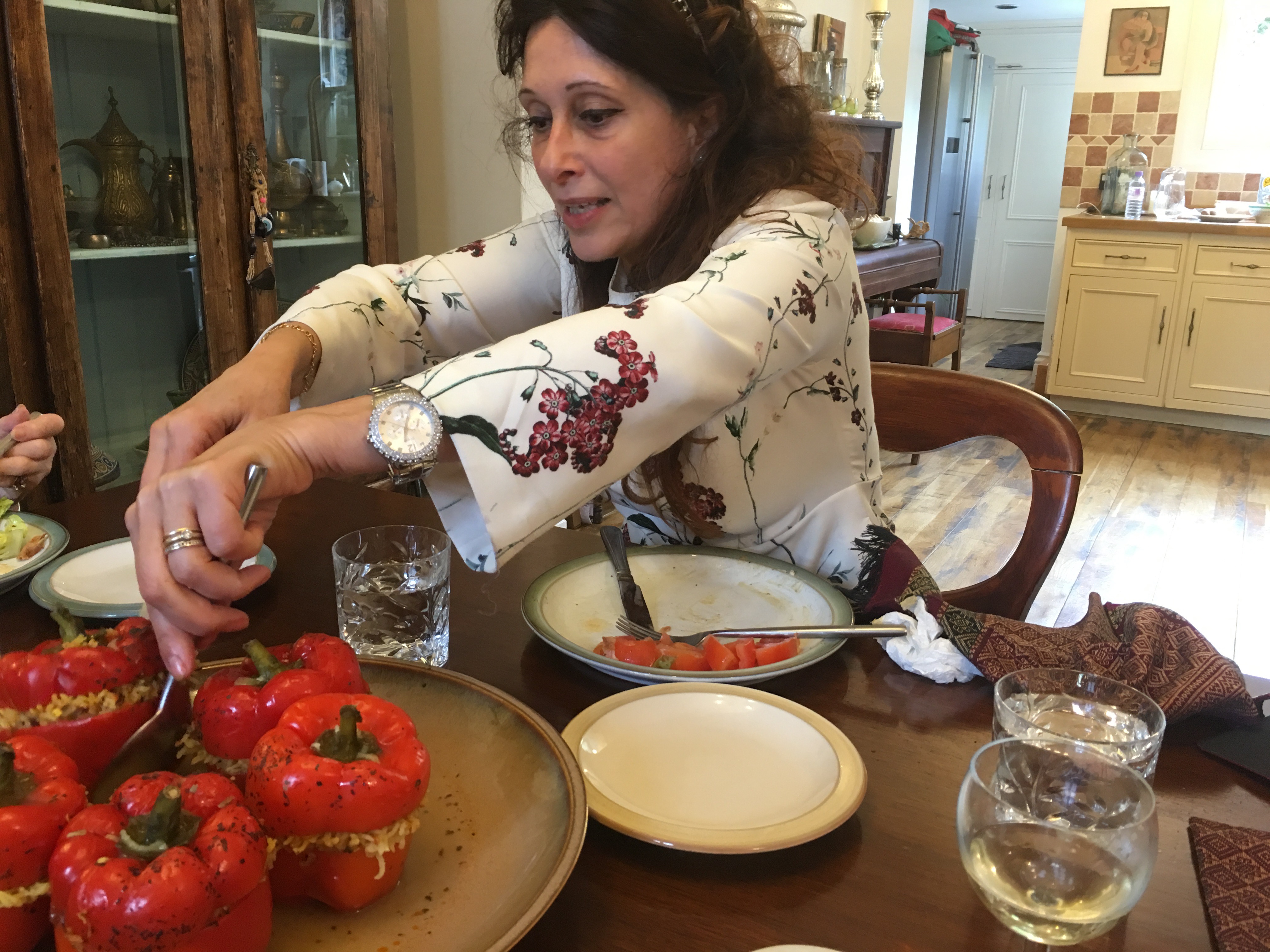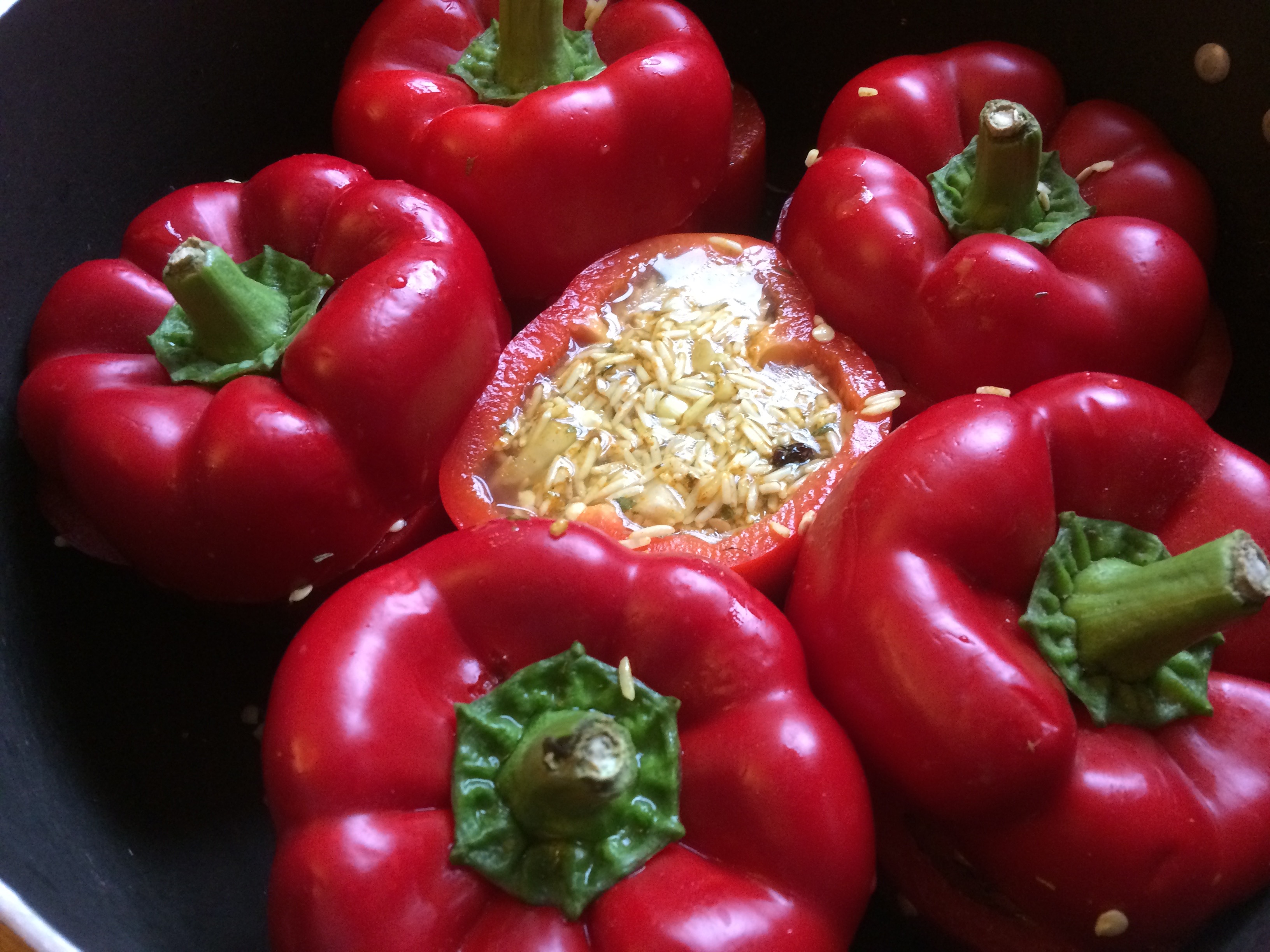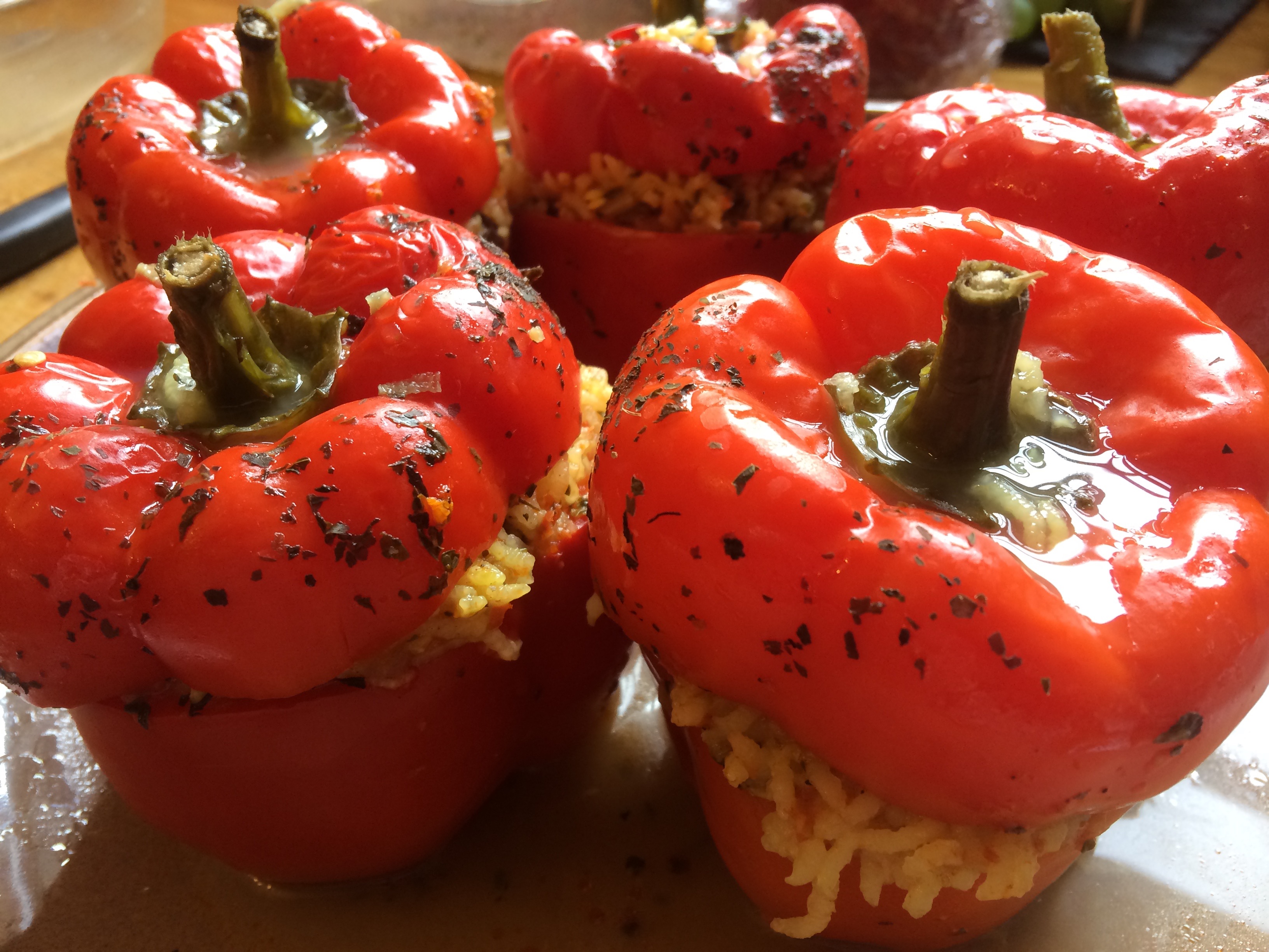 But it’s altogether a brighter prospect this year. In the Twickenham cafe I’ve been cooking for, we are preparing for the Rugby World Cup Final, which is being played on the day of Halloween. Our cake maker has come up with some wonderful designs that are displayed proudly in the window. My contribution is the most Halloween-like dish that I can think of — in looks at least. The bright red peppers stuffed with rice and herbs look like miniature pumpkins. This is a vegetarian version. With all the recent bad news about meat, that’s probably a good thing. The skin of the peppers themselves are as juicy and sweet whatever filling you put inside. Although looking at them now, the rice does give them a slightly unsettling vampire-like smile…
