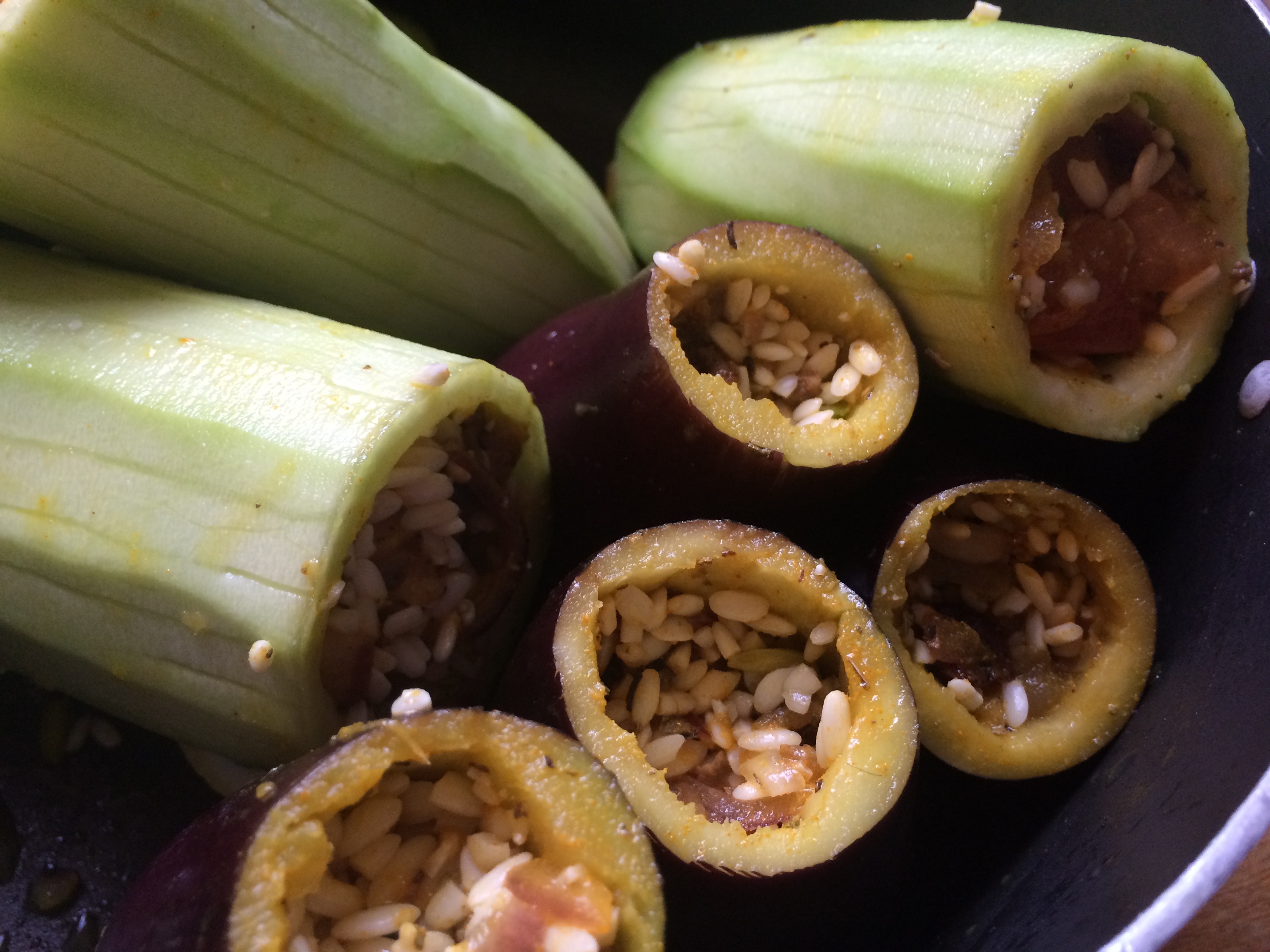 Stuff all the long marrows and aubergines equally and put in a medium pan
