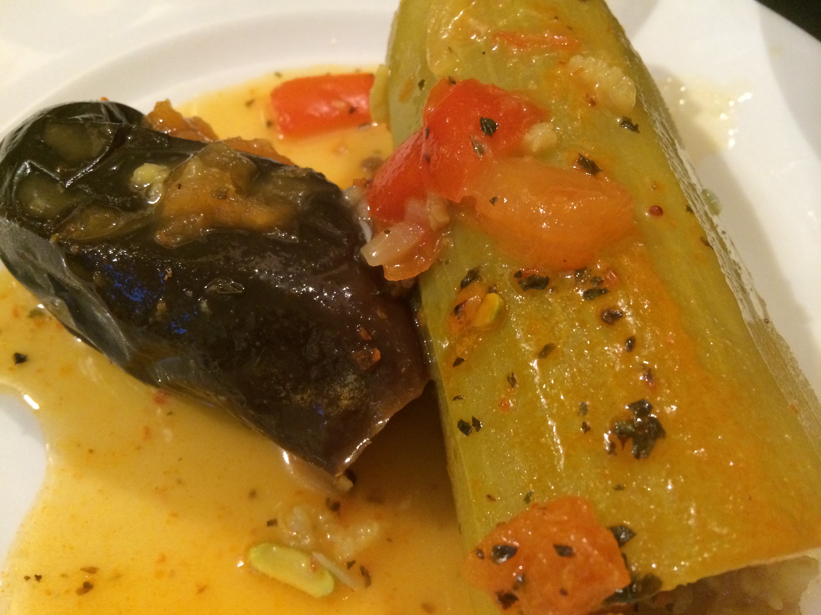 The figs have also been abundant, although the squirrels have probably already had the best of the crop. Our cat Bowie and the squirrels seem to have come to some kind of deal — perhaps something like the de-confliction agreement the Russians and Americans are recently said to have reached over Syria. Bowie lets them have the figs as long as he can get on with finding the most vulnerable and helpless small animals to toy with and perhaps also the narcotic angel trumpets that flourish beside the fig tree, perfuming the night even as winter approaches. Harvest was a time for my whole family to get together in the Bekaa — those who lived off the land the whole time joined at weekends by those who had chosen or had had chosen for them a very different life in the city. It was both beautiful and boring for me. But I loved the richness and abundance of tastes that the season brought — as well as the promise of even better things through the winter as the year’s produce was laid down in storage. Of course it’s very different here. I have no direct contact with the deep countryside and the work that is done there. Instead, I forage around my neighbourhood for the fruit that grows almost surreptitiously and by accident, ignored by everyone else. To celebrate this time of year, I have been making stuffed marrows and aubergines, filling them with rice, meat, fruit and spices. It is a hearty, healthy dish, bursting with life — for one last moment just as the fields here and in Lebanon are shorn of all their riches and go into hibernation.