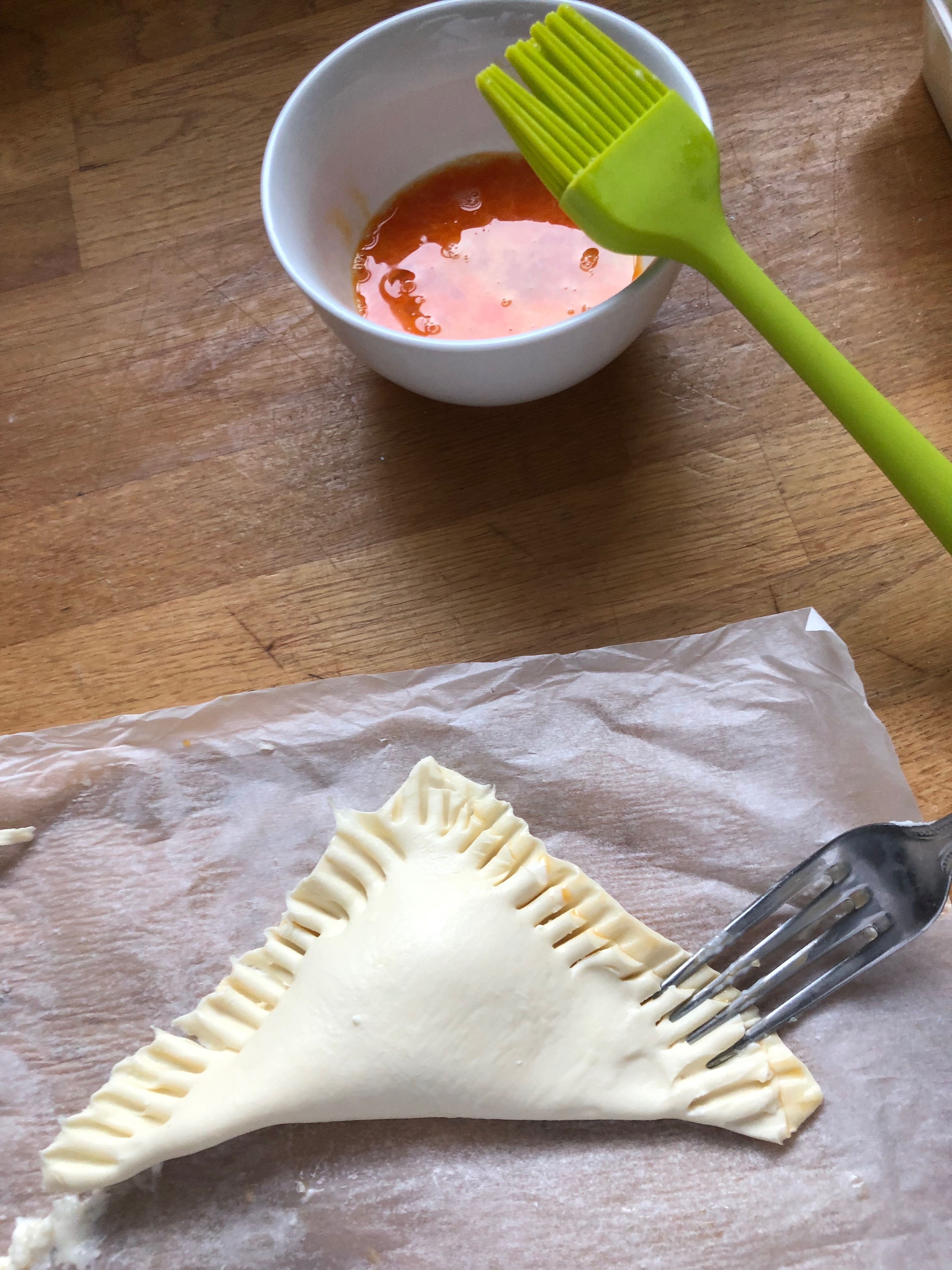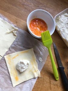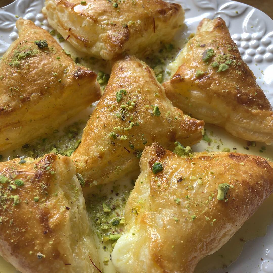 Cut the puff pastry into squares, around 8cm x 8cm. It will make around 16 squares. Fill each square in the middle with one spoonful of the cooked cream. In a small bowl, beat 1 egg, add the milk and whisk well. Brush the edges of the pastry with the egg mixture. Fold the pastry over the filling to form a triangle. Crimp the edges with a fork to seal. Place the filled pastries onto a baking tray and brush each triangle with the egg mixture. Put the tray in a pre heated oven 200 degree, on the middle shelf. Bake for 15-25 minutes or until the pastries are golden brown. Remove from oven and pour the saffron syrup on top immediately. Sprinkle the pastries with ground pistachio nuts and leave to cool before serving.